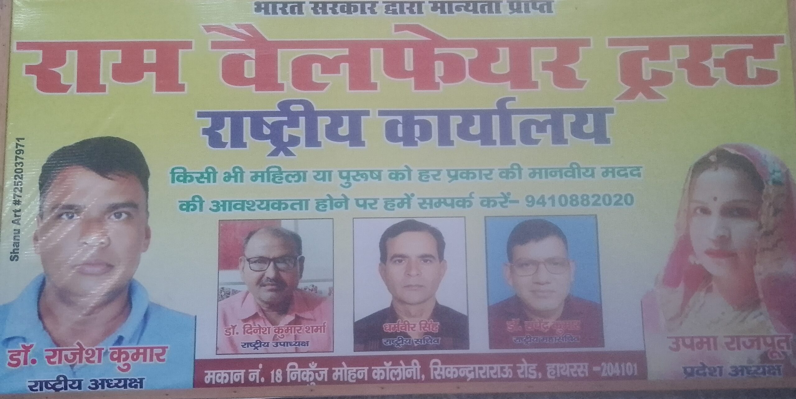 जिसमें कु०-अँजली को राम वैलफेयर ट्रस्ट केद्वारा हाथरस जिला प्रभारी बनाया गया तथा यश कुमार व गौरव कुमार को राष्ट्रीय कार्य कारिणी का सदस्य मनोनीत किया गया इसके साथ ही अर्जुन सिंह को राम वैलफेयर ट्रस्ट का सदस्य मनोनीत किया गया ।